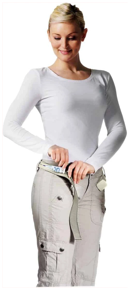 A rugalmas titkos rekesz az övre van rögzítve, és a nadrág belsejébe van behajtva. Így a pénz és az értéktárgyak láthatatlanul szállíthatók a rugalmas zsebben.